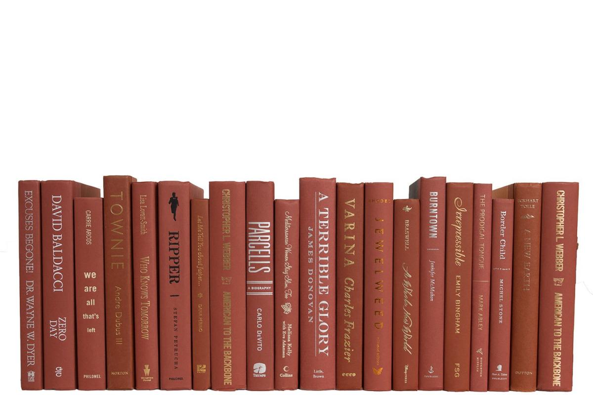 Transform your space with our Modern Sienna: Color By The Foot. Order as many linear feet as you need to complete your project. Authentic modern hardback decorative books in warm shades of reddish brown. All books are published 1980-present and include a variety of fiction and non-fiction titles. Each linear foot contains 10-12 books with an average height of 8.5-9.5". Titles will differ from those pictured.