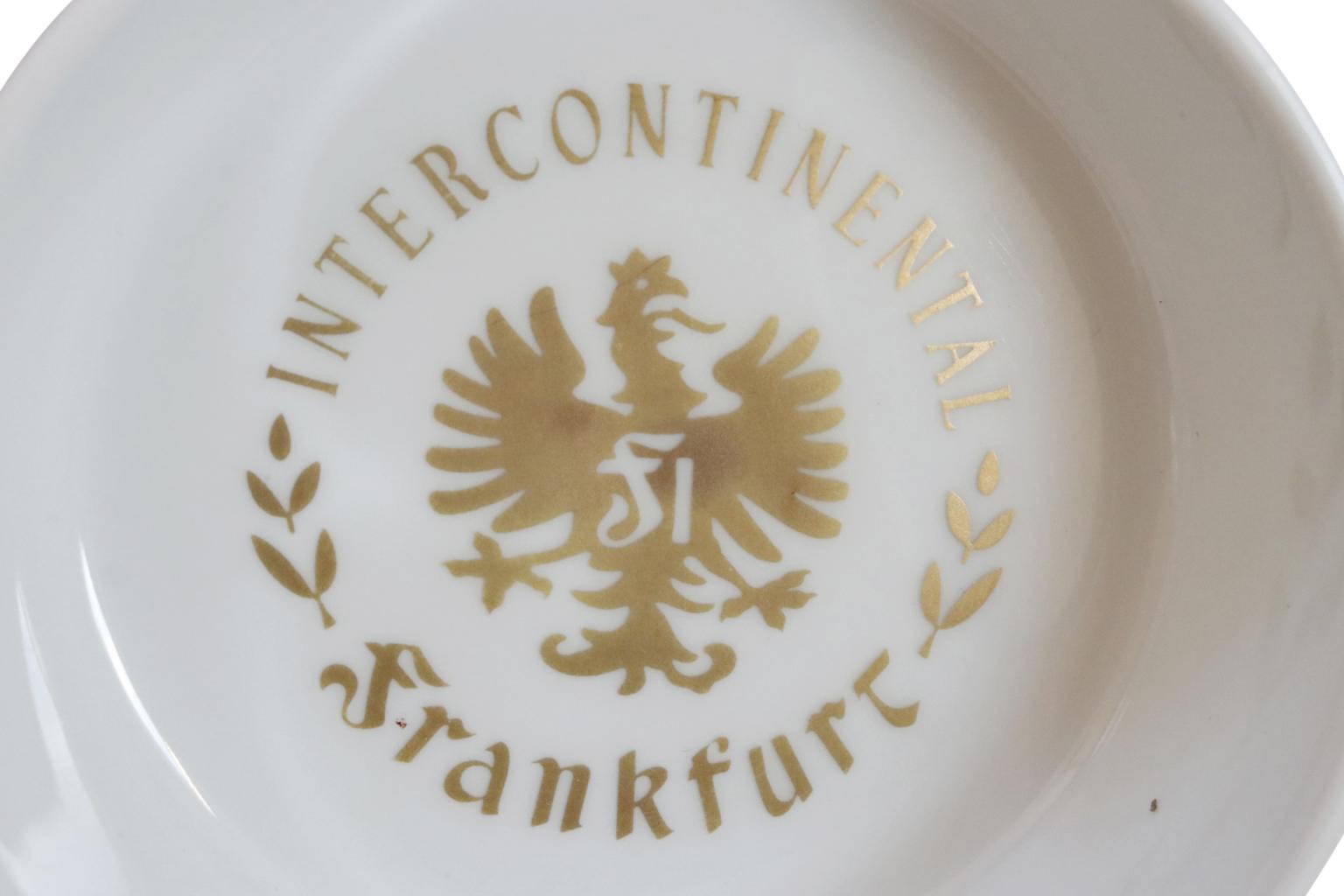 A cream ceramic ashtray from the Intercontinental Hotel in Frankfurt, Germany. The center is printed with the Intercontinental Hotel logo in gold. Marked underneath Schönwold, Germany. Hotel Intercontinental Frankfurt/Deutschland….