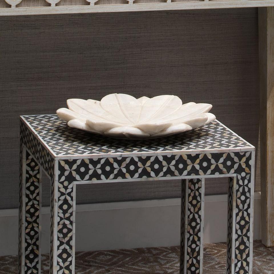 Designed to resemble a lotus flower, this decorative plate is crafted of white marble with two tiers of detailed, textural petals. The natural finish celebrates the organic beauty of the stone….