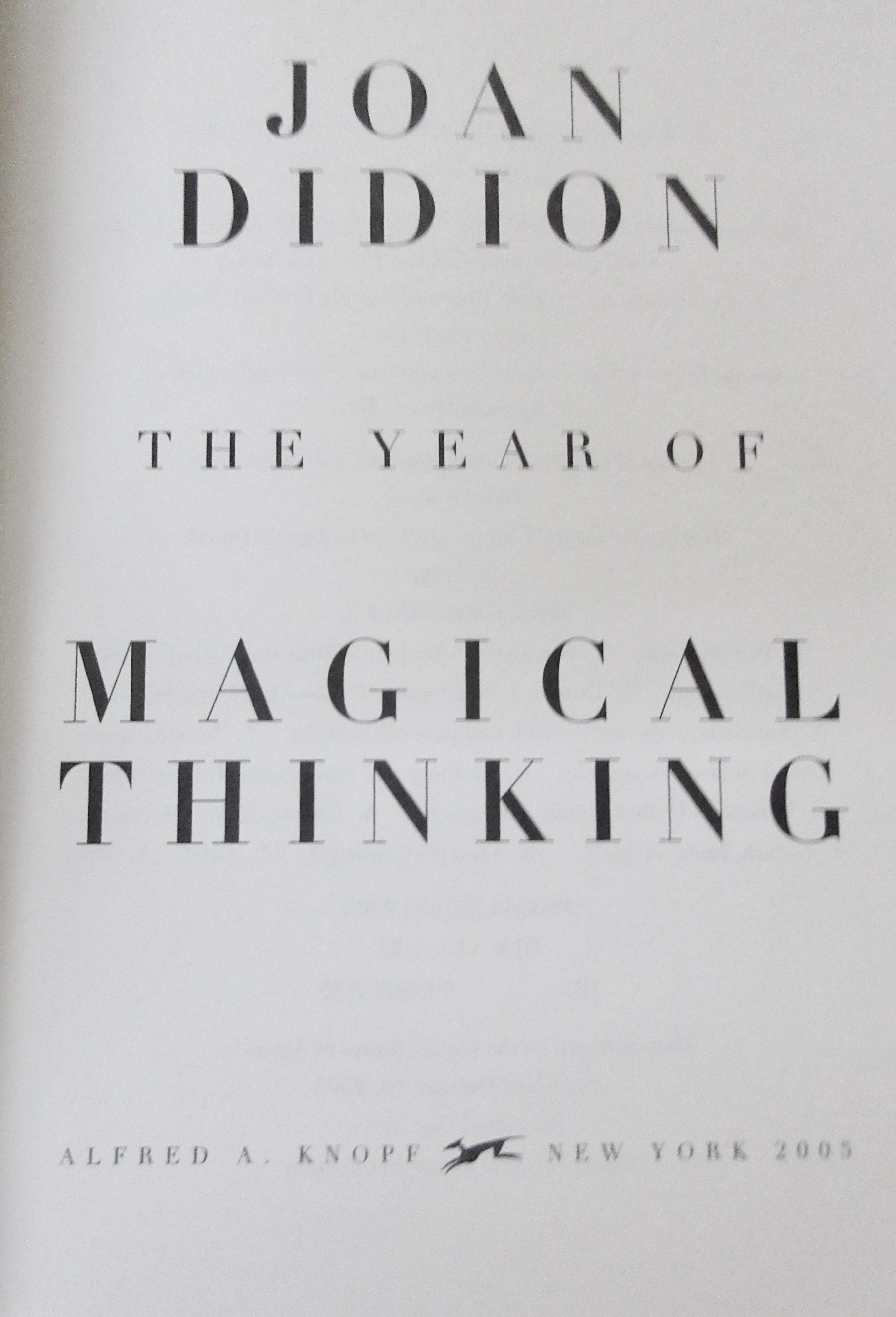 Both books by Joan Didion, hardcover.A Book of Common Prayer: Simon and Schuster New York 1977, first edition. 272 pages. With a reporter’s eye for detail, Joan Didion unspools this story of an American woman caught in a storm of international revolutionary politics. The Year of Magical Thinking: Knopf New York 2005, third printing before publication, 227 pages. In this sweet sad memoir, Joan Didion tells the story of her year after her husband John Gregory Dunne’s death.
