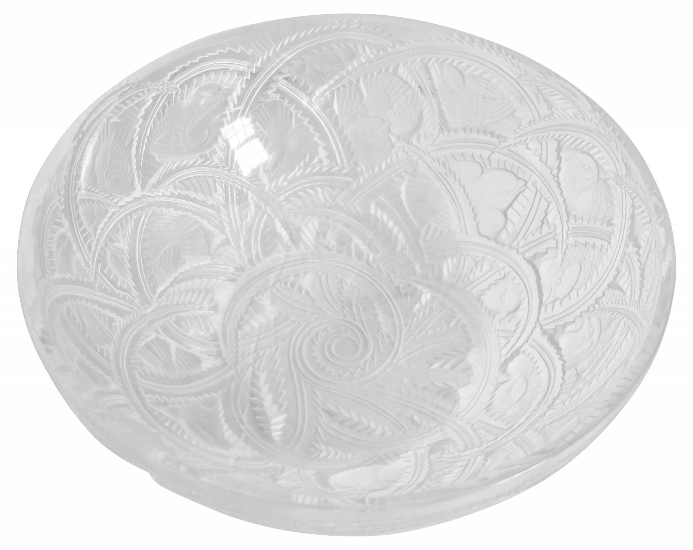 Lalique French Art Deco serving bowl designed by Rene Lalique in 1933. Underneath a perfect orb of French crystal lies a design sculpted onto a zig-zag pattern of fern fronds and sparrows. Etched on bottom in script "Lalique France."