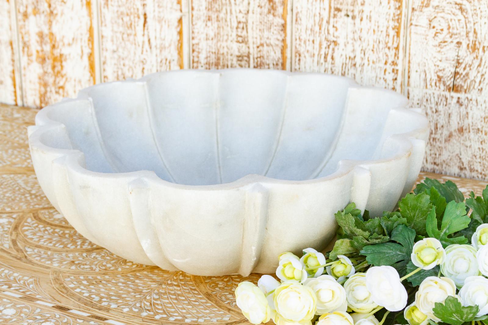 This beautiful bowl is carved from pure Makrana white marble and its inspired by a mandala flower. which represents love and hope. This traditional decorative Indian vessel shows some grain and features a wax polish feel.