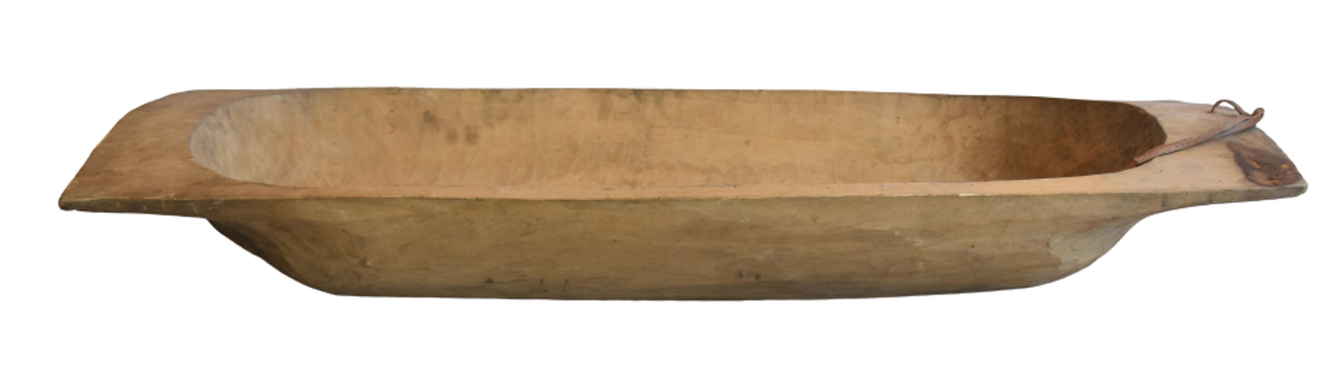 European hand-carved wood dough harvest bowl with leather hanging cord. No maker’s mark. Very good condition, wear consistent with age and use.