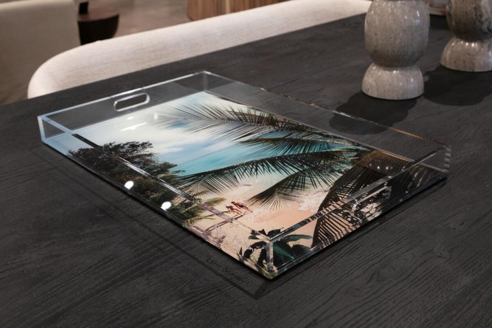Slim Aarons’s photographs of “attractive people doing attractive things in attractive places” bring a bygone glamour to any room, whether they’re hanging on a wall or, as is the case here, featured on the bottom of an acrylic tray. This photo of a couple strolling among the palm trees of Barbados was taken in 1976. Handcrafted in the USA, the tray has handles for easy carrying and high sides to help prevent objects from falling off.