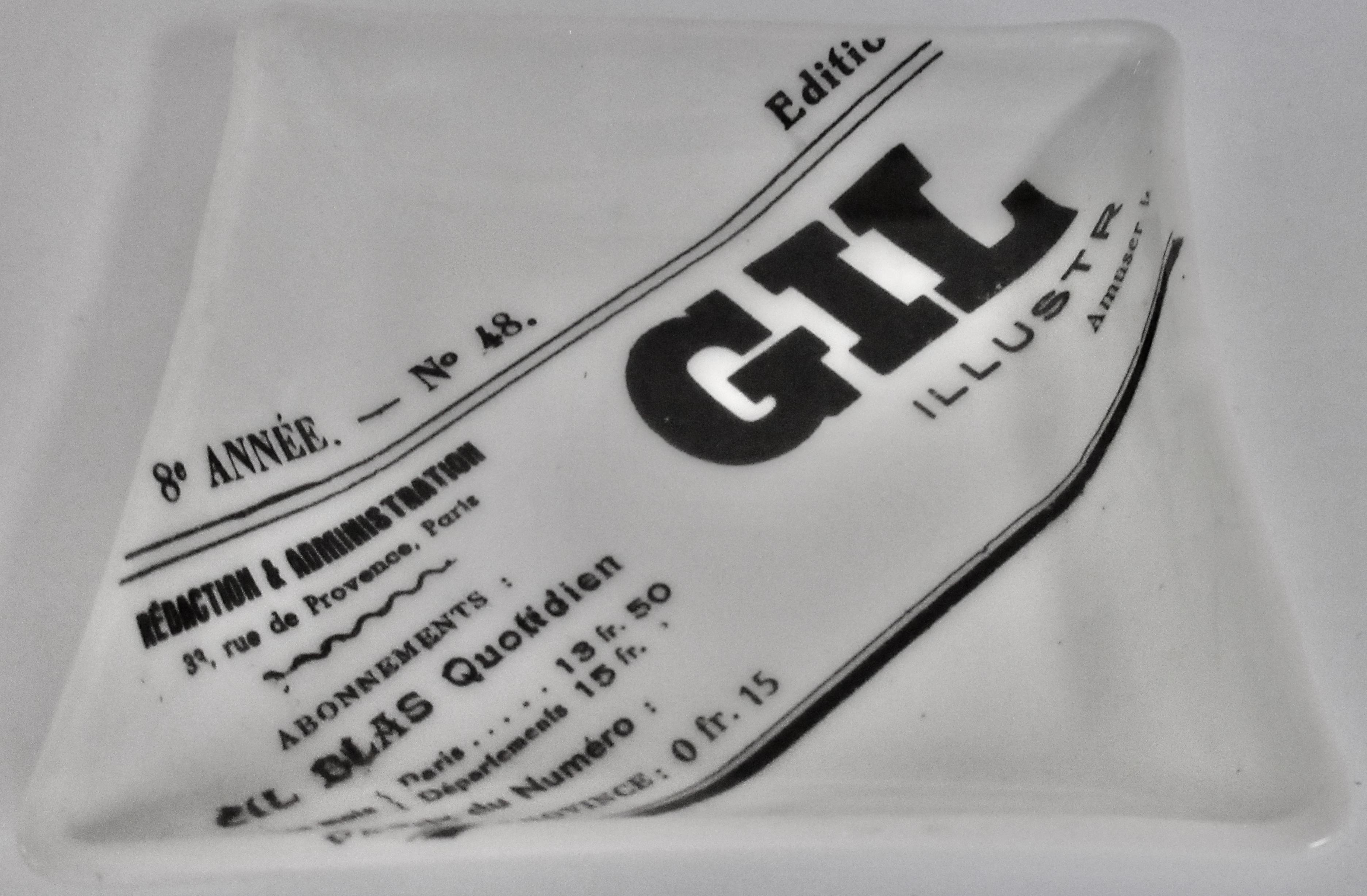 Mid-Century Modern French porcelain tray advertising the 19th century Paris periodical Gil Blas. Bold black graphics against a pure white P…