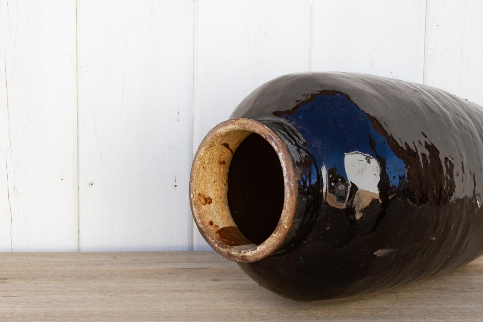 Martaban pots are large glazed ceramic jars originally made in Burma. These martaban jars were originally used to store oil and water that was traded along the silk road. This tall martaban pot has a distinctive simple shape with a wide mouth and a tapered base. This vintage Asian jar has a beautiful deep brown glazed finish.