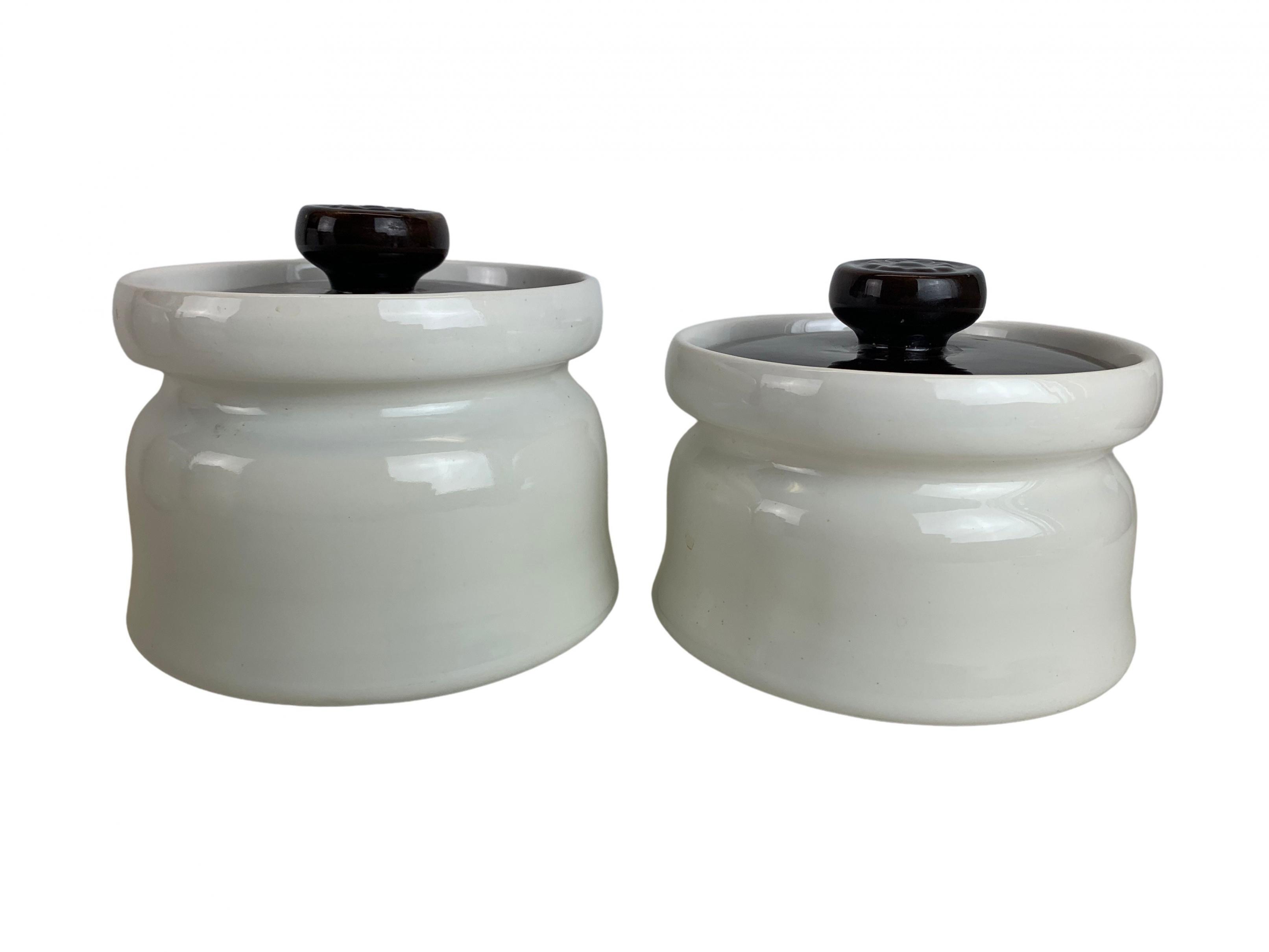 Set of four 1960s midcentury canisters in white and brown.Each lid handle has a embossed daisy.No makers mark.Light age, one small chip on inside of rim on 2nd smallest canister. Marked “USA” on lid underside. Heights: 8.5”, 7”, 5.5”, 4.5”.