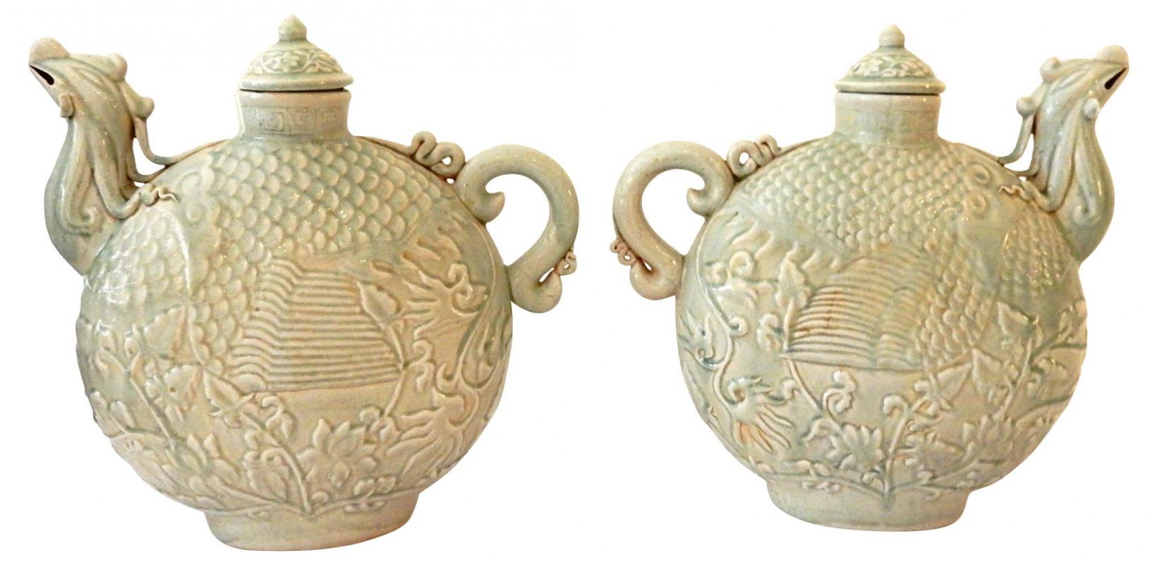 Pair of lidded porcelain jars in the shape of phoenixes with light green glaze. Two phoenixes together represent yin and yang….