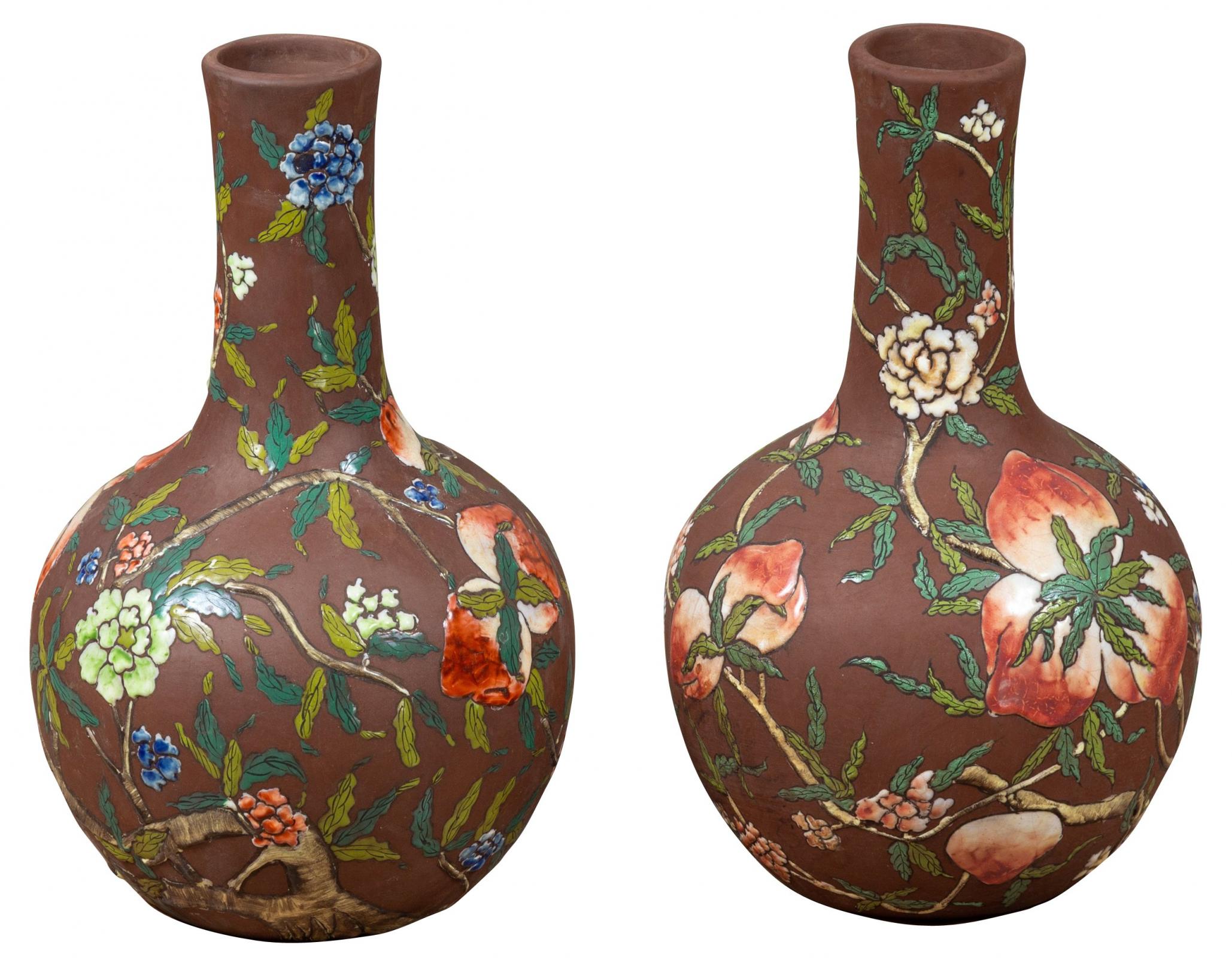 A pair of Chinese Kendi shape handmade vessels with fruit and flower motifs. Two pairs available, sold per pair. Each of this pair of Kendi shaped vases features a round belly topped with a long neck, adorned with colorful fruits and flowers standing out on a monochrome mat brown ground. With their petite proportions and delicate décor, this pair of Chinese vintage vases will bring a touch of elegance to any home, whether placed atop an étagère or console table. Each pair of priced $550.
