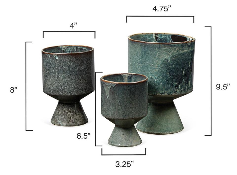 A lovely addition to the tabletop vignette, these urns are each handcrafted of ceramic with a flared base and a reactive blue glaze. Due to the handmade nature of these pieces, variations in tone and texture are to be expected.
