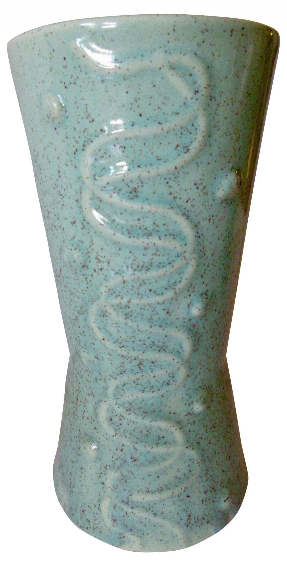 Set of two American pottery vases in beautiful shades of turquoise. One vase is mid-century Brush, light turquoise with tiny purple speckles, marked "Brush U.S.A.", 3.5"D, 7"H. The other vase is a classic fluted vase from the same period, sporting vertical ribbing, a leaf design and a scalloped top rim, unmarked, 6.5"D, 6.75"H.