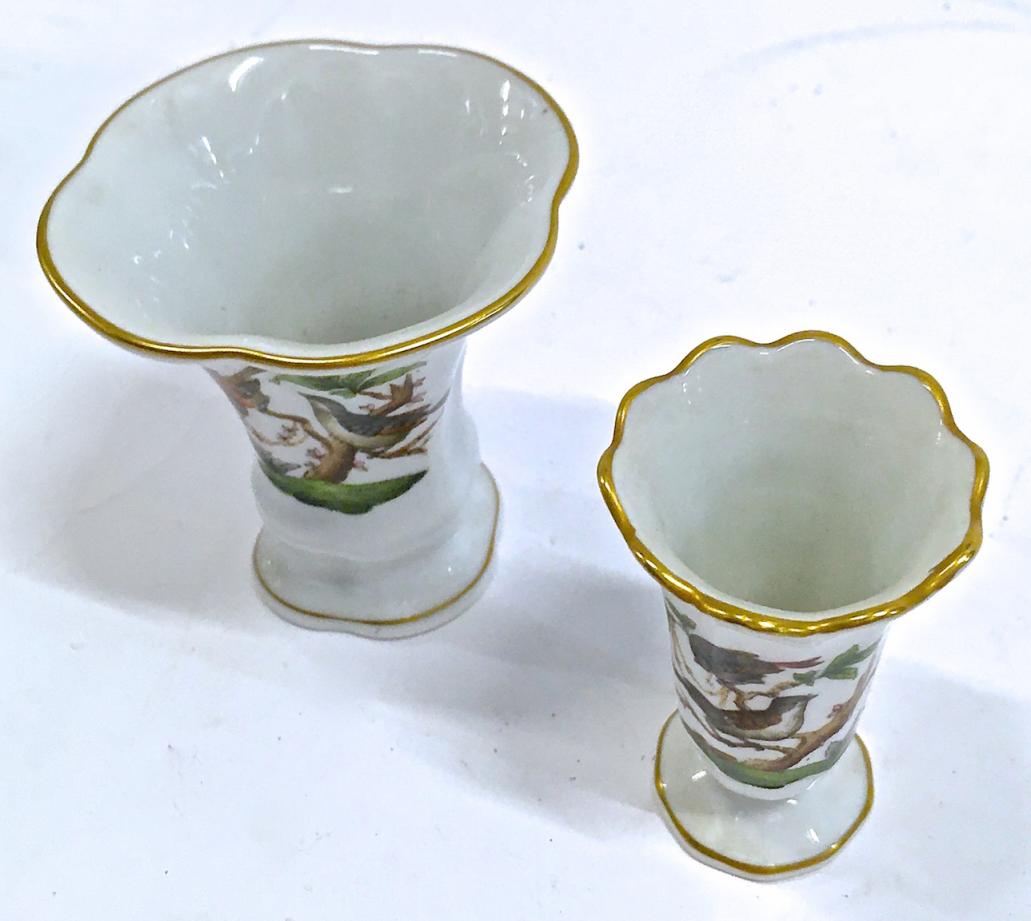 Pair of small Herend porcelain wild bird and butterfly illustrated bud vases. Wild birds hand painted on front and butterflies on the back. Larger vase measures: 2.5"L x 2.5"W x 2.75"H. Smaller vase measures: 1.5" Diameter x 2.5"H. Marked "Herend Hungary, Handpainted, 33, 7192, RO, 2" on the underside of one vase and marked Herend Hungary, Handprinted, 6434, RO, 2" on the underside of the other vase.Rothschild pattern.