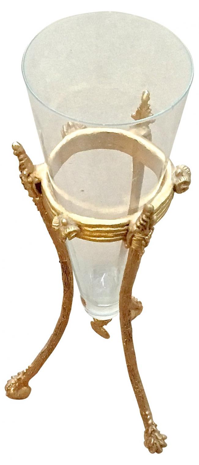 Vintage glass vase with a gilt-brass ram’s head holder with a Roman coin replica accent. No maker’s mark….
